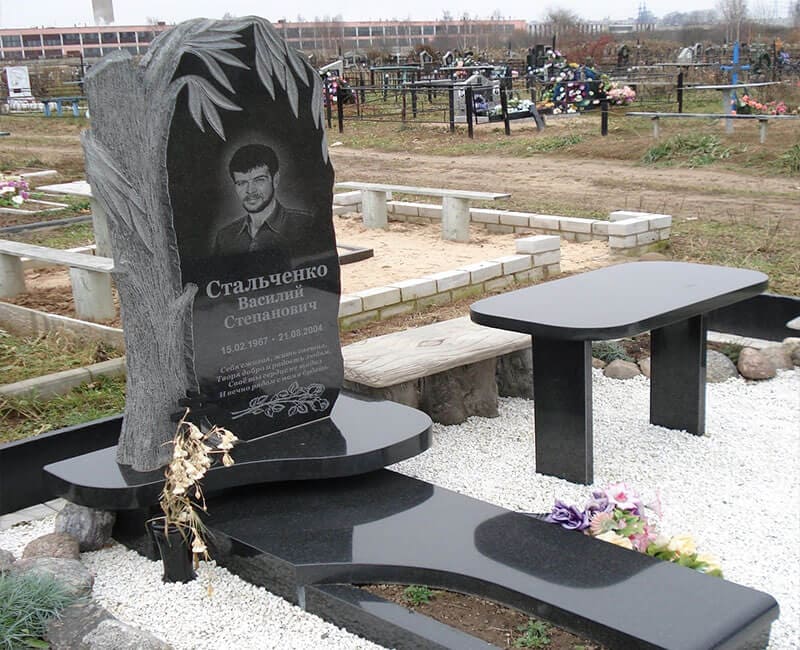 Стандартный комплект памятника включает в себя стелу, подставку и цветник. Плитка приобретается по желанию заказчика и за отдельную плату. Вместо цветника можно установить надгробную плиту.